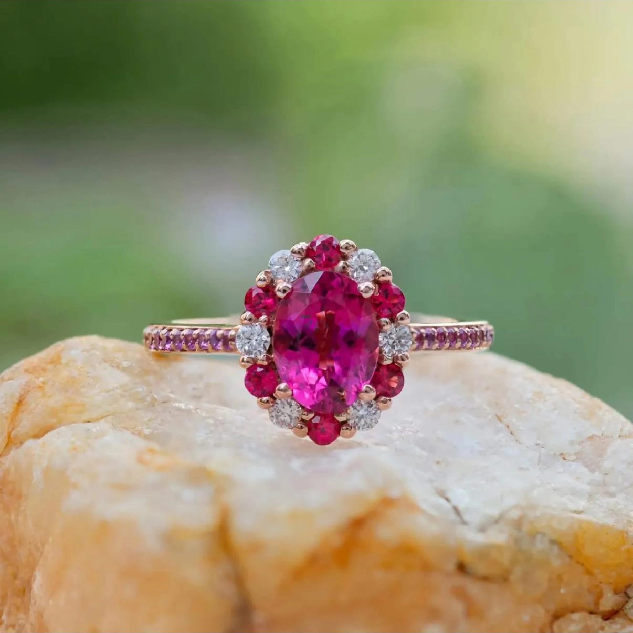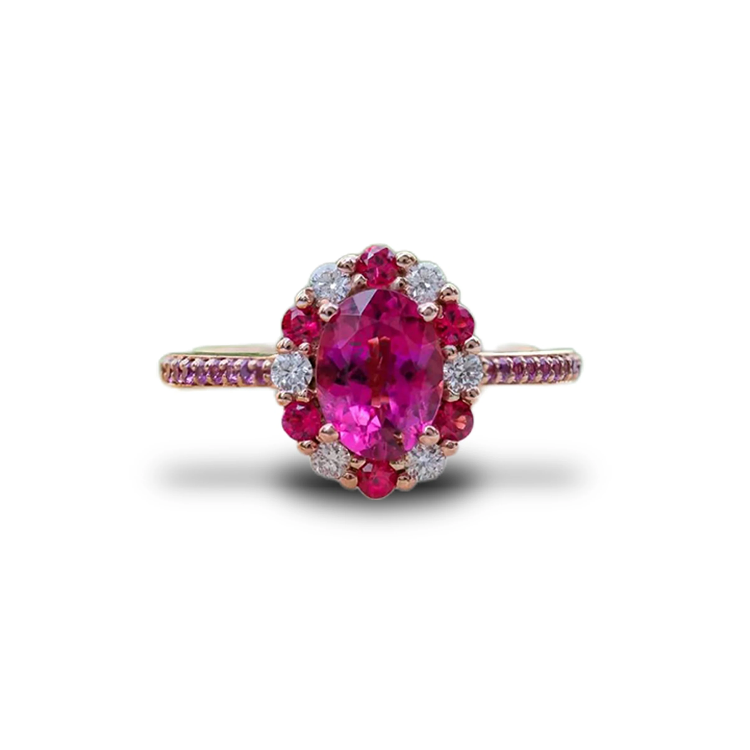 A luxurious ring crafted in 18K rose gold, featuring hot pink sapphires, sparkling diamonds, and a central oval pink sapphire. This exquisite design exudes elegance, femininity, and timeless charm.