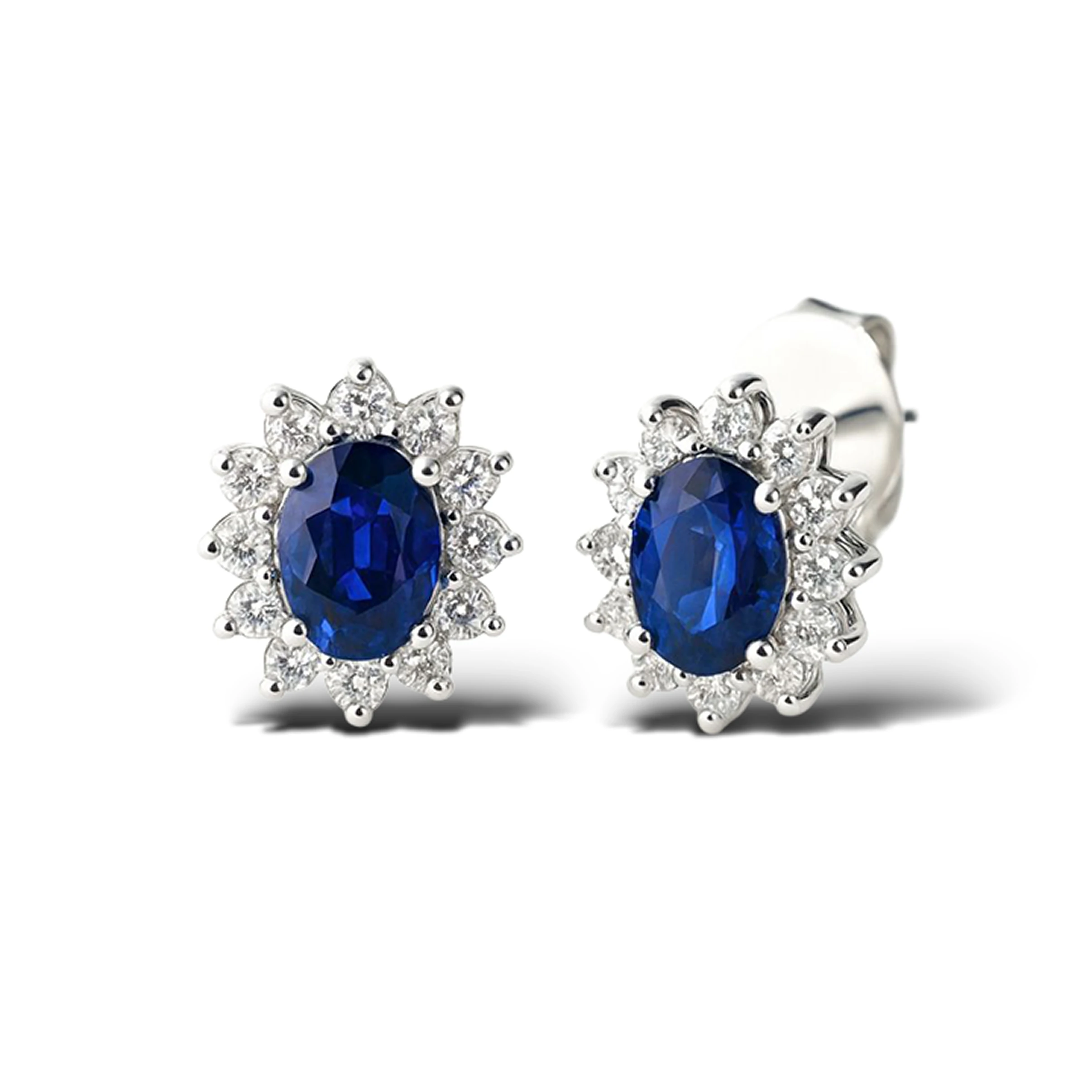 An elegant 18K white gold earring pair inspired by royal sophistication, featuring deep blue sapphires encircled by brilliant diamonds for a timeless, regal allure.