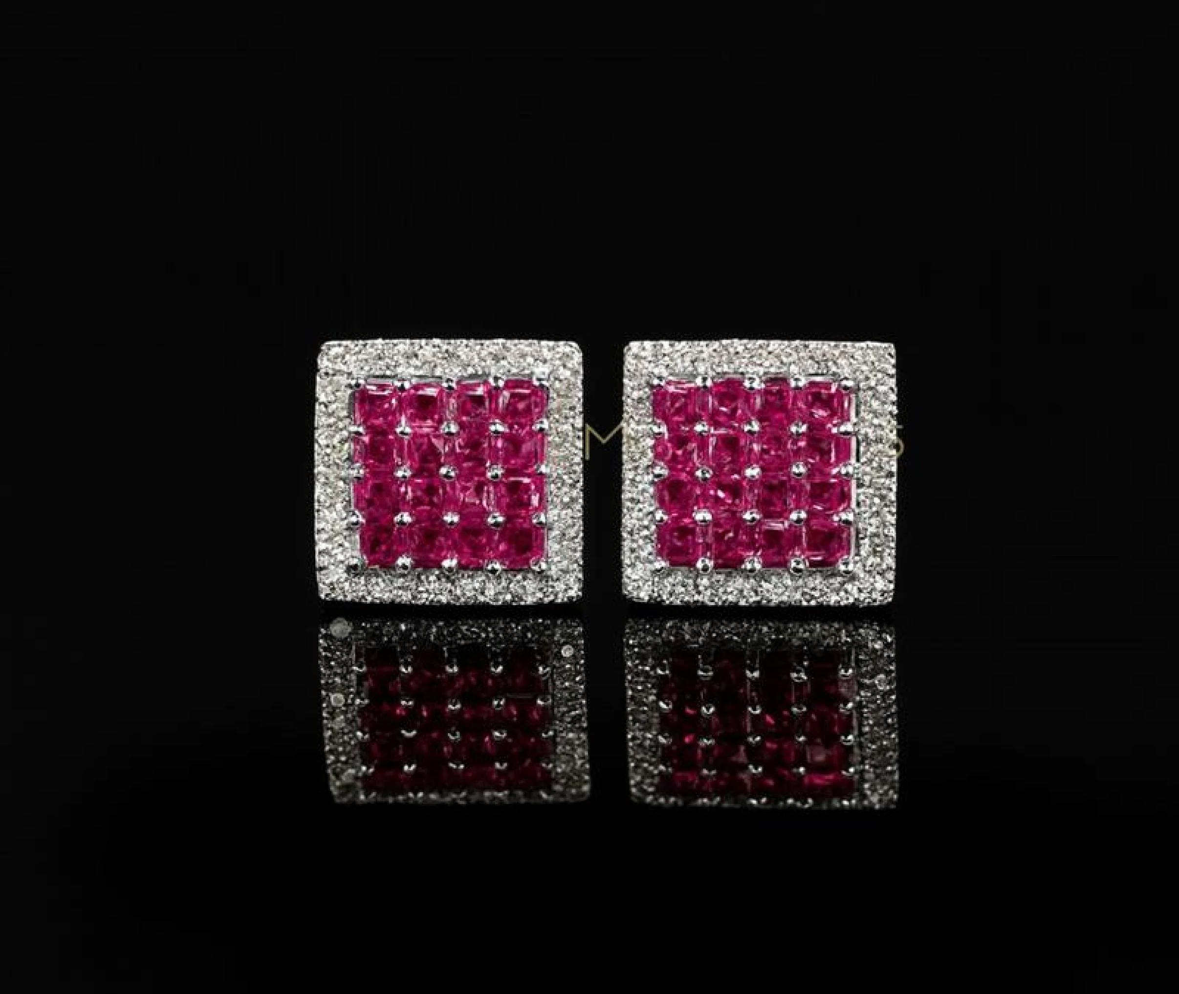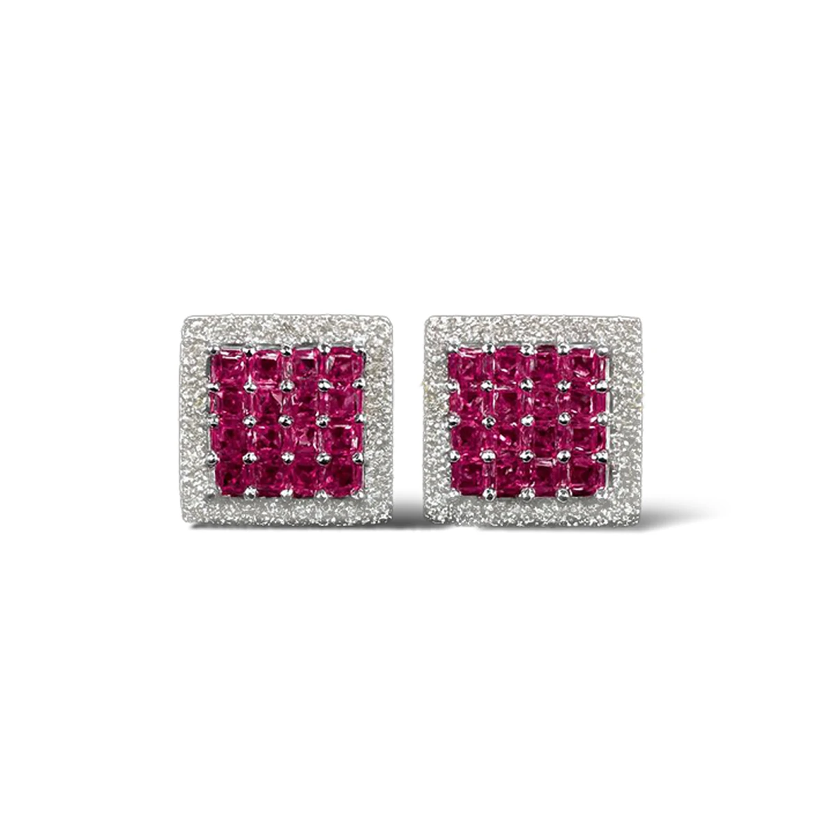 A graceful pair of 18K white gold earrings adorned with radiant pink sapphires and brilliant diamond clusters, capturing the essence of romance and luxury.